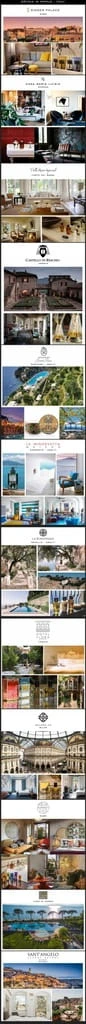 Hotel Warszawa Prudential building, Singer Palace, Casa Maria Luigia, Villa Roma Imperiale, Castello di Reschio, Monastero Santa Rosa, La Minervetta Maison, La Rondinaia, Hotel Flora, Galeria vik Milan, Palm Manfredi Rome, Hotel Corte Valier, Sant Angelo Matera